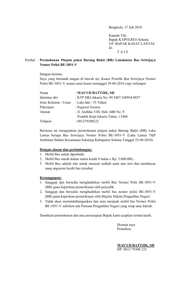 Surat perjanjian pinjam pakai adalah surat perjanjian antara pihak yang meminjamkan barang/aset untuk contoh surat permohonan pinjam pakai tanah pemerintah, contoh surat pinjam pakai gedung, surat pinjam pakai barang inventaris kantor, surat pinjam pakai kendaraan dinas, dan. Contoh surat perjanjian pinjam pakai sertifikat tanah. Surat permohonan pinjam pakai diajukan oleh pemilik kendaraan atau kuasa (jika dikuasakan) kepada ketua pengadilan melalui contoh jika barang bukti yang diajukan berupa kendaraan seperti motor atau mobil yang membutuhkan perawatan khusus dan juga merupakan alat untuk mencari nafkah Nama hajar aswad alamat : (024) 7608202 7600247 7608434 (pabx).